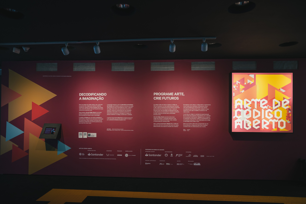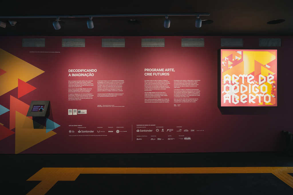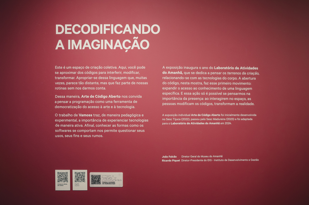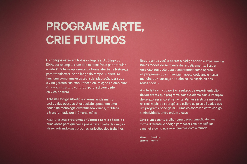 Os seres humanos, assim como os computadores, intercomunicam-se através de códigos, meios pelos quais a mensagem transita (sinais, gestos, fala, escrita). Seres humanos e computadores ao longo das décadas puderam sistematizar, organizar e relacionar praticamente todos os tipos de códigos, produzindo informações, previsões, cálculos, memória e Arte. Uma Arte feita em Código é resultado da experimentação de um artista programando computadores com a intenção de se expressar, instruindo-os em como realizar determinadas operações, calibrando possibilidades que um programa é capaz de gerar, numa cooperação entre código e criatividade, determinismo e imprevisibilidade, ordem e caos. Na exposição Arte de Código Aberto, o artista-programador Vamoss propõe uma trajetória poética no contra-fluxo de artistas e programadores: a obra, diante dos olhos do público, projeta diversas imagens e também o programa que o constitui, com todos os seus parâmetros, regras e dimensões. Esta exposição está organizada em dois núcleos: Interativa e Gerativa. No núcleo Interativo, o público é convidado à interagir com o código aberto, mudando a relação entre os dados apresentados, reprogramando-os e experimentando novas apresentações. Já no núcleo de obras gerativas, as obras são formadas no instante da exposição, renovando-se de tempos em tempos, criando imagens inéditas e irrepetíveis. Ao compartilhar o código que compõe o cerne das imagens, podemos ver como tudo é feito: desde a linguagem na qual a obra foi construída, aos parâmetros e sinais que determinam a estrutura do trabalho: interação acontece de maneira colaborativa, provocando o público a experimentar suas próprias ideias, desvendando possibilidades e descobrindo caminhos. Essa é uma oportunidade de compreender como operam os programas que influenciam nossa maneira de viver: nas máquinas hospitalares, nas escolas, na mídia, nos celulares, nas redes sociais, modulando nossa emoção, orientando nosso comportamento, presentes em todas as partes do planeta e para além dele, antes, durante e depois de nossas existências. Compreendendo como essas ferramentas operam e funcionam, é possível também imaginar como todas as coisas que nos cercam, visíveis e invisíveis, podem influenciar, orientar e afetar a maneira como nos relacionamos com o mundo.