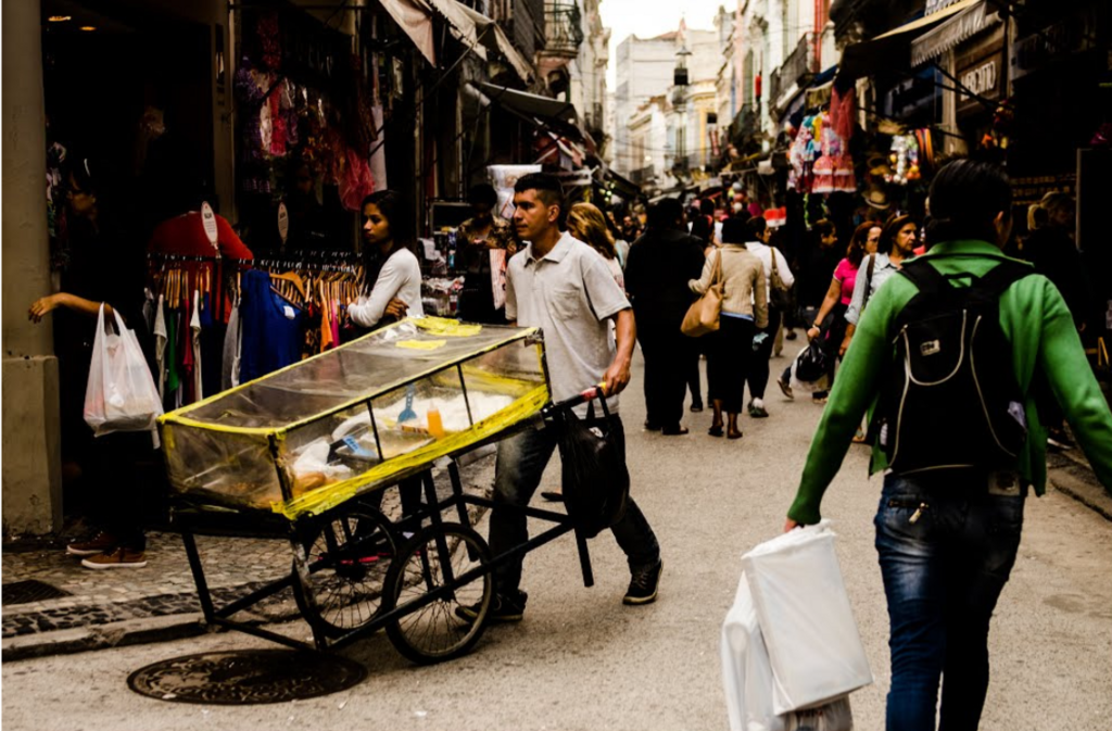 What motivates someone to consume excessively, beyond their daily needs? The issue is complex, but global capitalist society encourages overconsumption. Humanity today needs 1.5 planets to maintain its general consumption pattern. A quarter of the world's population living in developed countries demands no less than three-quarters of the planet's natural resources. Will we be able to combine sustainable consumption with quality of life, satisfaction, and respect for the planet? Above, merchants and customers on one of the busiest streets in downtown Rio.