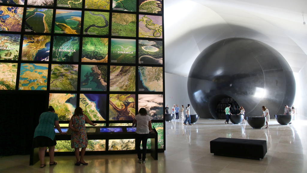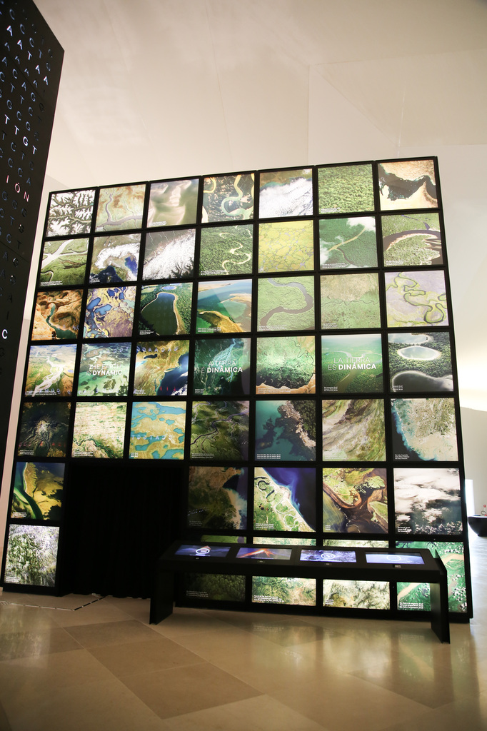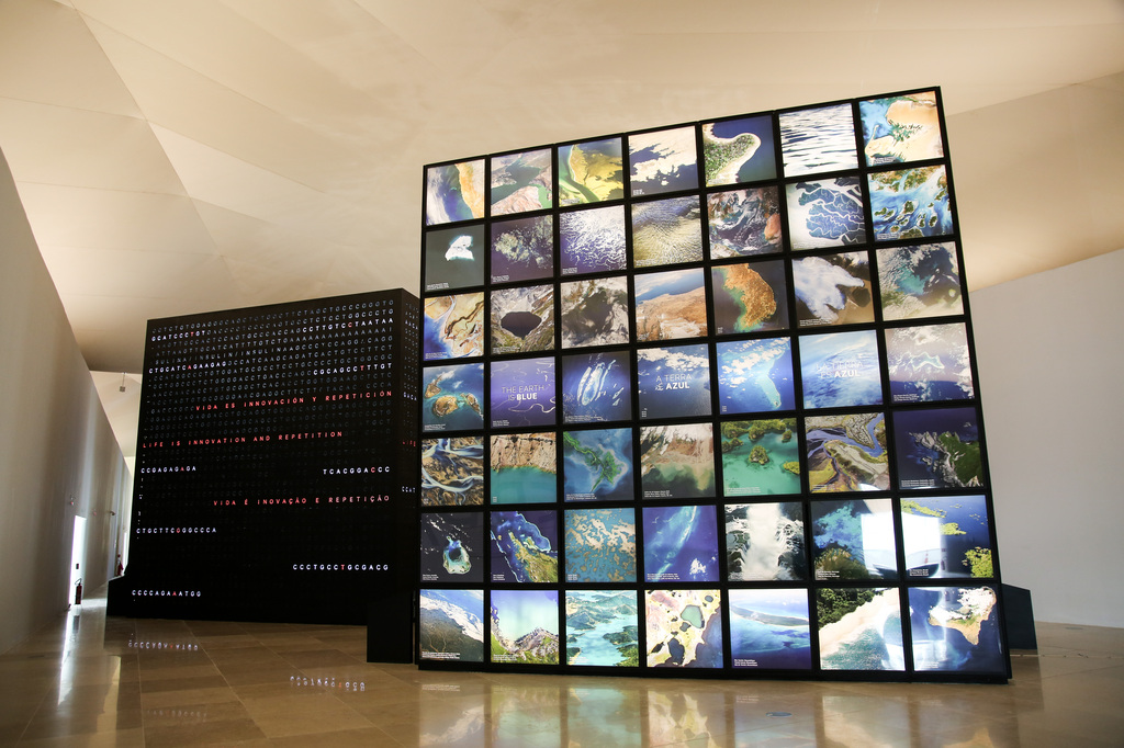 The Cube of Matter is an exhibition installation in the shape of a cube (700 x 700 x 700 cm) covered with 188 images (summed up on its 4 external sides). Located between the totems of "Cosmic Horizons" and the "Cube of Life," it features the text "Matter" in front of its entrance, an audio recording, directed to the outside area, of cosmonaut Yuri Gagarin and astronomer Carl Sagan – entitled "The Earth is Blue" – and two interactive totems – one located at the entrance and the other at the exit of the installation. Inside the Cube of Matter, there is a video installation entitled "4 Oceans," and the kinetic sculpture "4 Oceans Vortex Generator," by the artist Daniel Wurtzel. The texts related to the content of the Cube of Matter can be found in the Additional Information > Text section.