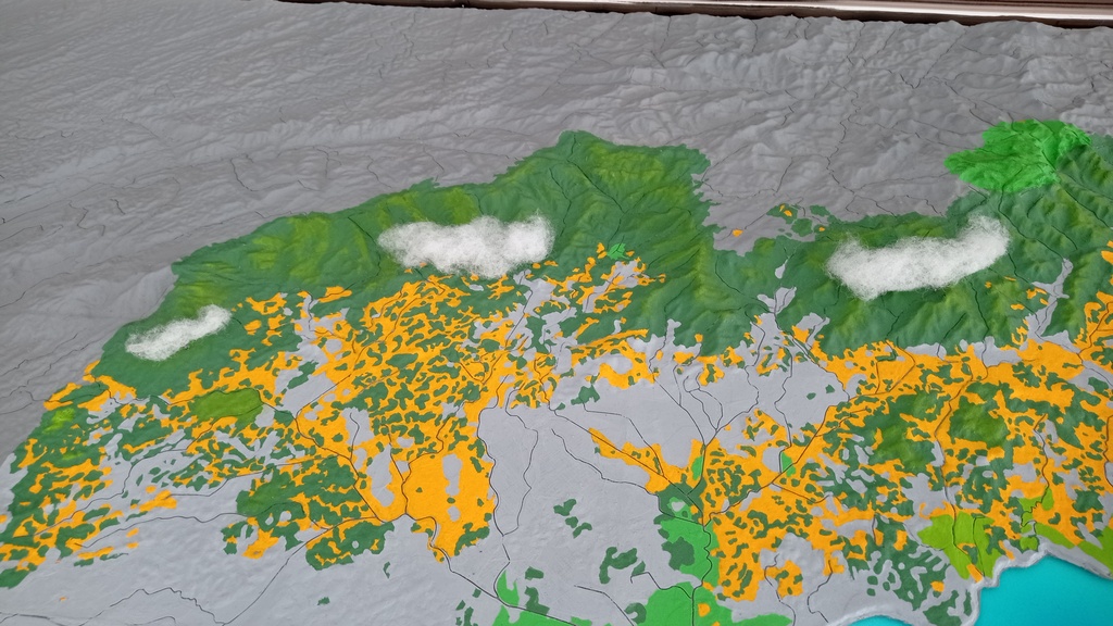 From the mountains to the ocean (braille panel) In an ecosystem, everything is connected in a complex and delicate network. In Guanabara Bay, this involves the connection to the open sea through a channel, which means that half of its waters are renewed every 12 days. It also involves the presence of a mangrove forest, which serves as a nursery for various species. The bay is also affected, of course, by the 17 municipalities and the rivers in its surroundings. Check out the bay's hydrographic basin on this tactile map, which covers 480,000 hectares. The rivers in this area pass through forests, pastures, plantations, and cities, and this is reflected in the quality of their waters when they reach the bay. Thus, to conserve it, it is necessary to care for this entire environment and its population.