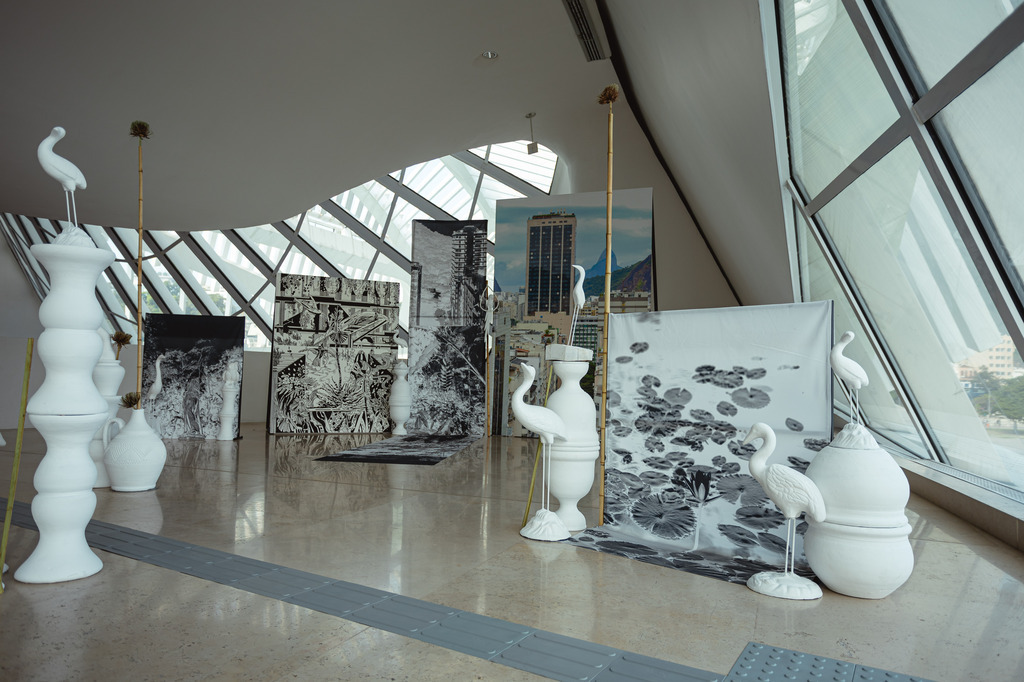 Then, like an arranged, poetic, traced path, I rewrote the intersecting forms in this moment of passion and visual and sensory frenzy. My greatest desire is to offer the viewer a narrative in which my words and images are the narrators through a collection of photos, paintings, drawings, and sculptures. I designed this installation as an environment with multiple scales and multiple visual entry points, where, whether you are small or large, adult or child, we can all freely engage with this practice of space. 3D forms coexist, such as vases (which I found in the city), tools and objects that traverse worlds, eras, and all civilizations, or birds (which also know all the journeys between worlds) of all origins and materials. All are painted white, as if to tie them to the same territory. Their presence is the guarantee of this oasis, and invites us on a stroll full of trinkets and undulations, in this temporary encampment of the Museum of Tomorrow. The photo of Copacabana, visible as a possible opening, and upon which emerges a wave of paper with drawings, born from the real and the phantasmagorical, is the first image I took on the first morning I woke up in Rio...
